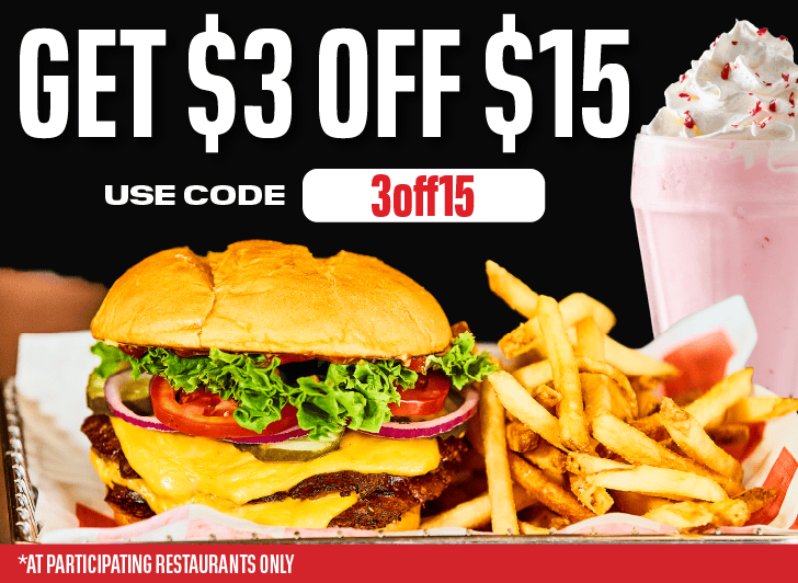 Offer valid only from 12/29/2025 through 1/4/26 at participating Smashburger locations in the contiguous U.S. Pricing and participation may vary. Coupon may be utilized in store or online through the smashburger.com website or Smashburger app during regular business hours. Store hours may vary. Offer to receive a $3 discount applied to an order of $15 or more (before taxes). For in-store orders, must provide promo code 3off15 at checkout to redeem offer. For online orders, must enter promo code 3off15 at checkout to redeem offer. Limit of one (1) offer may be redeemed per transaction. Discount does not apply to any applicable sales tax. Cannot be used in conjunction with any other offer, promotion, or discount. Not valid on previous purchases. No cash value (unless prohibited by law, then cash value is $.005). No substitutions. No rainchecks. Company reserves the right to withdraw or change the offer’s terms and conditions at any time, at Smashburger’s discretion, and without notice. While supplies last. © 2025 Smashburger IP Holder LLC. All rights reserved.